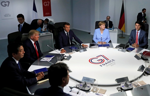 Ο πρωθυπουργός της Ιταλίας, Giuseppe Conte, ο πρωθυπουργός της Ιαπωνίας, Shinzo Abe, ο πρόεδρος των ΗΠΑ, Ντόναλντ Τραμπ, ο πρόεδρος της Γαλλίας, Εμμανουέλ Μακρόν, η καγκελάριος της Γερμανίας, Άνγκελα Μέρκελ και ο πρωθυπουργός του Καναδά, Justin Trudeau, σε σύνοδο εργασίας κατά την διάρκεια της συνόδου κορυφής της G7 στο Μπιαρίτζ της Γαλλίας, στις 26 Αυγούστου 2019. REUTERS/Carlos Barria/Pool
