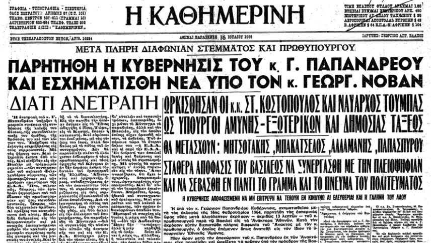 Ο Κωνσταντίνος Καραμανλής αυτοεξορίζεται στο Παρίσι τον Δεκέμβρη του 1963 μετά το ξαφνικό «μπούλινγκ» από το Παλάτι και τη σφοδρή αντιπαράθεση με την αντιπολίτευση του Γεωργίου Παπανδρέου. Ενώ ο βασιλεύς Παύλος πεθαίνει, ο νεαρός διάδοχος Κωνσταντίνος Β΄ αναλαμβάνει τον θρόνο την άνοιξη του 1964 έχοντας να αντιμετωπίσει σκληρά ζητήματα. Έτσι η αδύναμη και ακέφαλη πλέον Δεξιά, το ζήτημα της Κύπρου, ο αμερικανικός παράγων, οι συνωμότες στον στρατό και ο υποτιθέμενος κίνδυνος κομμουνιστικής απειλής, ήταν κάποια τρανταχτά σημεία που οδήγησαν τα Ανάκτορα να δράσουν ενεργά με σκοπό να έχουν τον πλήρη έλεγχο στο ελληνικό στράτευμα.