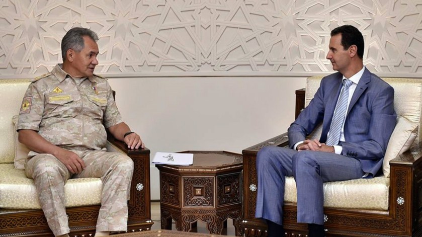 A handout photo made available by Syria’s Arab News Agency SANA shows Syrian President Bashar al-Assad(R) with Russian Defense Minister Sergey Shoygu (L) in Damascus, Syria.