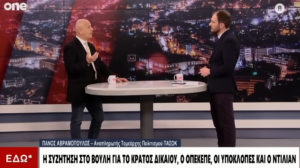 Ο Αν. Γραμματέας Πολιτισμού του ΠΑΣΟΚ Πάνος Αβραμόπουλος, μίλησε στην εκπομπή «ΕΔΩ» στο«OneChannel» με τον Βαγγέλη Καποδίστρια (17-4-26), για τα συγκλονιστικά σκάνδαλα που ταλανίζουν την κυβέρνηση της Νέας Δημοκρατίας και την πολιτική ζωή, τις ατέρμονες γαλάζιες δικογραφίες με στελέχη καθ ΄ολοκληρίαν της Νέας Δημοκρατίας, τον εκβιασμό του κουΝτίλιαν προς τον πρωθυπουργό Κυριάκο Μητσοτάκη, που τον αποκαλούσε για το σκάνδαλο των παρακολουθήσεων – Υποκλοπών «Έλληνα Νίξον», για την ένοχη σιωπή των κεντρικών υπουργών της Νέας Δημοκρατίας, που καίτοι παρακολουθούντο, δεν προσέφυγαν στην δικαιοσύνη, όπως ο πρόεδρος του ΠΑΣΟΚ Νίκος Ανδρουλάκης, για το ξεχείλωμα των απευθείας αναθέσεων που ξεπέρασε τα 13 δις από την κυβέρνηση της Ν.Δ. τον τετραπλασιασμό των προσλήψεων ημετέρων μετακλητών στην κυβέρνηση και την ευρύτερη θεσμική διάλυση του κράτους.