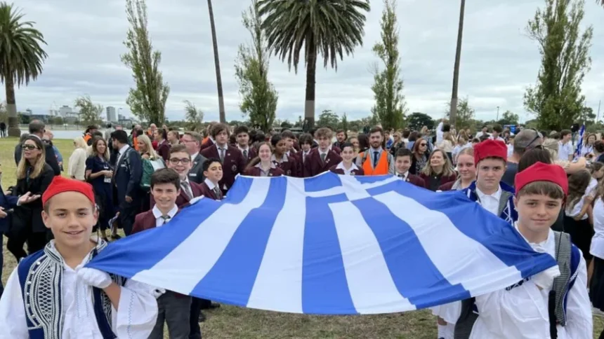 Σημαίες της Ελλάδας, της Αυστραλίας, της Κύπρου και της Ιεράς Αρχιεπισκοπής Αυστραλίας από μαθητές του Ελληνορθοδόξου Σχολείου Oakleigh Grammar