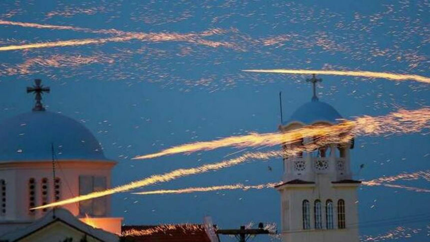 Στη συνέχεια, ακολουθεί «παύση πυρός» για να προσέλθουν οι πιστοί στην Εκκλησία και μόλις ακουστεί το «Χριστός Ανέστη» βροχή φλεγόμενων ρουκετών ξεσπάει ανάμεσα στις ενορίες. Ο νικητής του «πολέμου» μεταξύ των αντικριστών εκκλησιών ανακηρύσσεται λίγα λεπτά μετά την Ανάσταση και η μονάδα μέτρησης είναι οι περισσότερες πετυχημένες βολές στο καμπαναριό του «αντιπάλου».