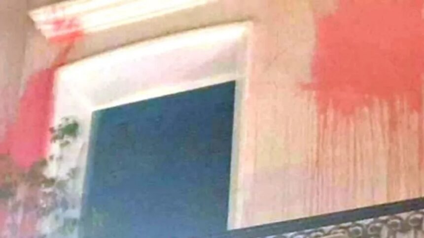 Στην συνέχεια, εκτόξευσαν επτά γυάλινα μπουκάλια, τα οποία περιείχαν κόκκινο χρώμα, προκαλώντας με αυτό τον τρόπο φθορές στην πρόσοψη του κτιρίου, ενώ ζημιές προκλήθηκαν και σε ένα ΙΧ επιβατικό αυτοκίνητο που ήταν σταθμευμένο κοντά στο κτίριο.