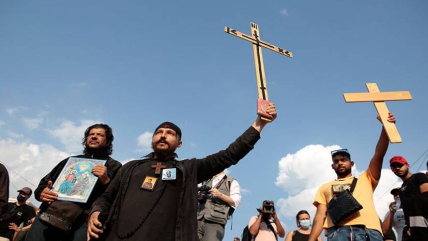 Κάποιοι κρατούν ελληνικές σημαίες ενώ υπάρχει και ένα πανό στο οποίο αναγράφεται: «Όχι στον υποχρεωτικό εμβολιασμό». Στην συγκέντρωση υπάρχουν ρασοφόροι καθώς και άλλοι που κρατάνε μεγάλους σταυρούς και εικόνες αγίων.