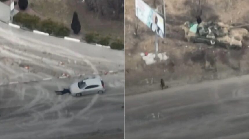 Είναι περίπου 14.16 το μεσημέρι, και το drone καραγράφει διάφορα αυτοκίνητα που δεν είναι στρατιωτικά, αλλά απλά επιβατικά, να κατευθύνονται προς το κέντρο του Κιέβου. Οι πρώτοι οδηγοί μπορεί να πρόσεξαν τα ρωσικά τανκ και να έκαναν αναστροφή, ωστόσο ένα γκρίζο-ασημί αμάξι επιβραδύνει και σταματά. Τότε συμβαίνει κάτι φρικτό: Ένα άτομο βγαίνει από το αυτοκίνητο με τα χέρια σηκωμένα ψηλά αλλά δέχεται πυρά και πέφτει κάτω ακριβώς πίσω από το αυτοκίνητο. Οι Ρώσοι στρατιώτες τρέχουν από τις θέσεις τους στον τόπο του εγκλήματος. Το γεγονός ότι είναι Ρώσοι στρατιώτες είναι εμφανές από τα λευκά διακριτικά που φορούν για να ξεχωρίζουν από τους εχθρούς στην Ουκρανία, εξηγεί το ZDF.