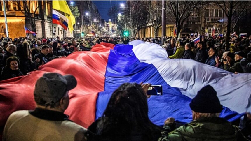Χιλιάδες Σέρβοι, ανεμίζοντας ρωσικές και σερβικές σημαίες και κρατώντας αφίσες του Βλαντίμιρ Πούτιν, πραγματοποίησαν χθες Παρασκευή πορεία στο κέντρο του Βελιγραδίου και συγκεντρώθηκαν έξω από την πρεσβεία της Ρωσίας για να εκφράσουν την αντίθεσή τους στην προσπάθεια της κυβέρνησής τους να κρατήσει αποστάσεις από τη Μόσχα όσον αφορά στη ρωσική εισβολή στην Ουκρανία.