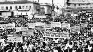 9 Μαΐου 1956: Μαζικό συλλαλητήριο της ΠΕΕΚ στην Ομόνοια, κατά του επικείμενου απαγχονισμού των Καραολή και Δημητρίου στη Λευκωσία (πηγή: Εφημερίδα «Καθημερινή»).