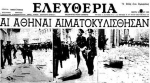 Πρωτοσέλιδο εφημερίδας «Ελευθερία», 10 Μαΐου 1956. Η αστυνομία ενισχύθηκε από δυνάμεις της χωροφυλακής και του στρατού για να εμποδίσει τους διαδηλωτές να φτάσουν στις ξένες πρεσβείες …