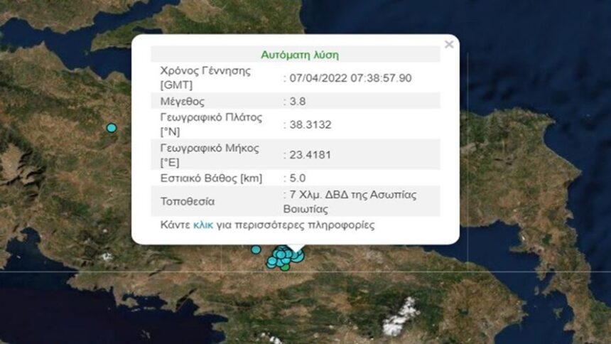 Σεισμός: Σεισμός μεγέθους 3,8 Ρίχτερ, σύμφωνα με την αυτόματη λύση του Γεωδυναμικού Ινστιτούτου, σημειώθηκε στις 10:38 το πρωί της Πέμπτης (7/4) με επίκεντρο 6 χιλιόμετρα ανατολικά της Θήβας.