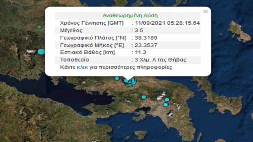 Σεισμός 3,5 Ρίχτερ ταρακούνησε το πρωί του Σαββάτου στη Θήβα σύμφωνα με την αναθεωρημένη λύση του Γεωδυναμικού Ινστιτούτου. Ο σεισμός σημειώθηκε 3 χλμ ανατολικά από τη Θήβα και είχε εστιακό βάθος 11,3 χλμ.
