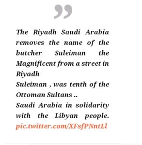 Όπως φαίνεται από τις αναρτήσεις του LNA στο Twitter, του οποίου ηγείται ο στρατάρχης Χαλίφα Χαφτάρ, στο Ριάντ της Σαουδικής Αραβίας απομάκρυναν την πινακίδα του Σουλεϊμάν Α’ του Μεγαλοπρεπούς, ενώ στην Αίγυπτο η οδός Σελίμ Α’ μετατράπηκε σε οδό Αχμέντ Μάνσι, δηλαδή του συνταγματάρχη που είχε σκοτωθεί μαχόμενος ισλαμιστές στο Σινά το 2017.