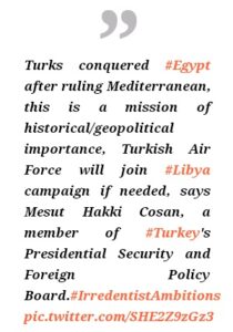 “Οι Τούρκοι κατέκτησαν την Αίγυπτο αφότου εξουσίασαν τη Μεσόγειο, πρόκειται για αποστολή ιστορικής / γεωπολιτικής σημασίας, η Τουρκική Πολεμική Αεροπορία θα συμμετάσχει στην εκστρατεία της Λιβύης εάν χρειαστεί”.