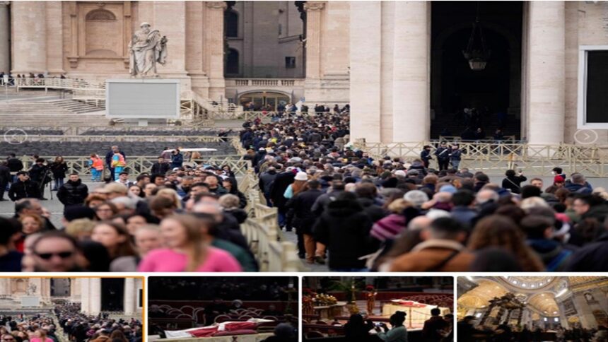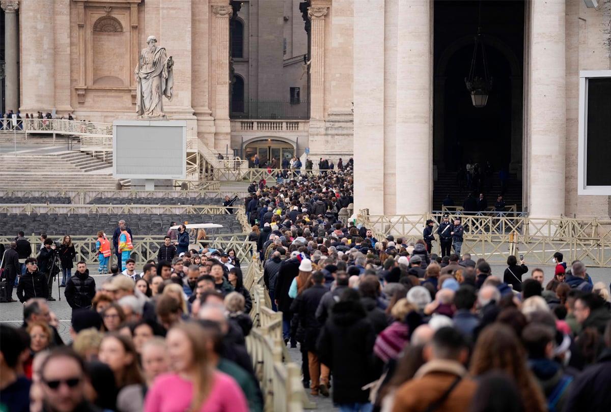 Η προσέλευση των πιστών έχει ξεκινήσει και πρόκειται να διαρκέσει μέχρι την Τετάρτη το βράδυ. Έχει ήδη σχηματισθεί, την ώρα αυτή, ουρά 10.000 ανθρώπων. Από τους πρώτους που μετέβησαν στον Άγιο Πέτρο, ήταν ο Ιταλός πρόεδρος της Δημοκρατίας Σέρτζιο Ματαρέλα και η Ιταλίδα πρωθυπουργός, Τζόρτζια Μελόνι.
