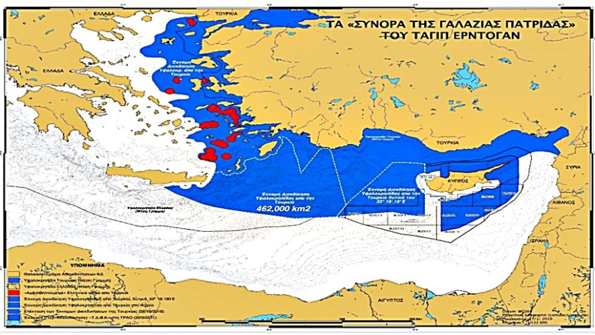 Ο χάρτης αυτός απεικονίζει πώς ο Ερντογάν εννοεί τη «Γαλάζια Πατρίδα», που σημαίνει κυριαρχία στη θάλασσα και στον αέρα. Μια πολιτική που ξεσηκώνει τσουνάμι διεκδικήσεων σε βάρος των κυριαρχικών δικαιωμάτων της Ελλάδας και της Κύπρου.