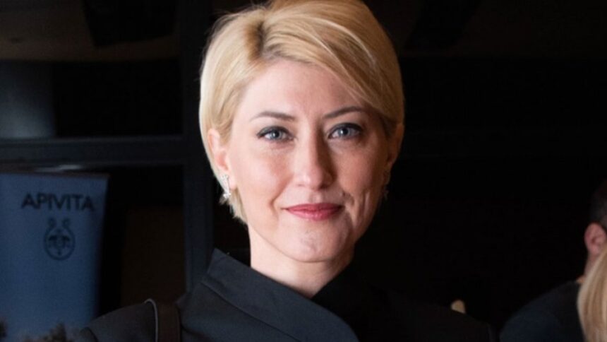 Η Σία Κοσιώνη επέλεξε για την περίσταση επέλεξε ένα μαύρο tailored παντελόνι σε ίσια γραμμή το οποίο συνδύασε με ένα structured σακάκι με ιδιαίτερο γιακά.