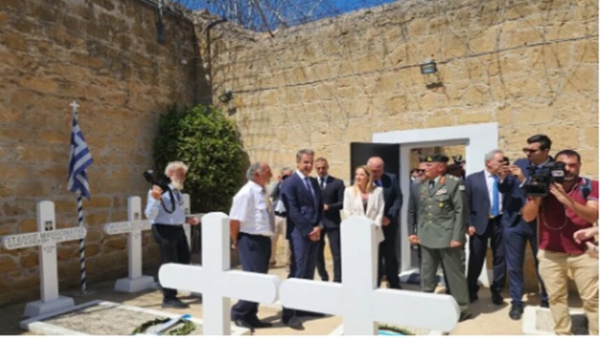 Μετά την επίσκεψη στο Τύμβο της Μακεδονίτισσας ο πρωθυπουργός Κυριάκος Μητσοτάκης βρέθηκε και στα Φυλακισμένα Μνήματα όπυ κατέθεσε στεφάνι στη μνήμη των Ηρώων που έπεσαν για την ελευθερία της Κύπρου και την Ένωση με την Μητέρα Πατρίδα.