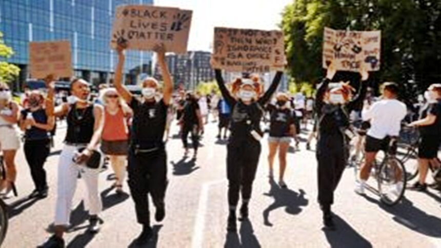 Οι διαδηλωτές γονάτισαν στην Τραφάλγκαρ Σκουέρ του Λονδίνου φωνάζοντας «Καμία δικαιοσύνη, καμία ειρήνη» και στη συνέχεια πραγματοποίησαν πορεία προς το κοινοβούλιο και κατέληξαν έξω από την αμερικανική πρεσβεία.