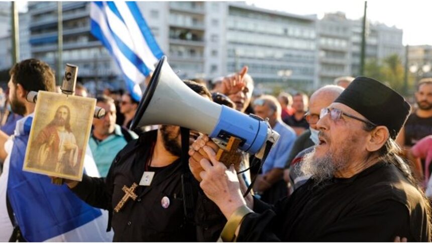 Οι διαδηλωτές κρατούν πανό, πλακάτ, σταυρούς και ελληνικές σημαίες και φωνάζουν «κάτω η χούντα του Μητσοτάκη», ενώ μάλιστα ζητούν από τον πρωθυπουργό να παραιτηθεί.
