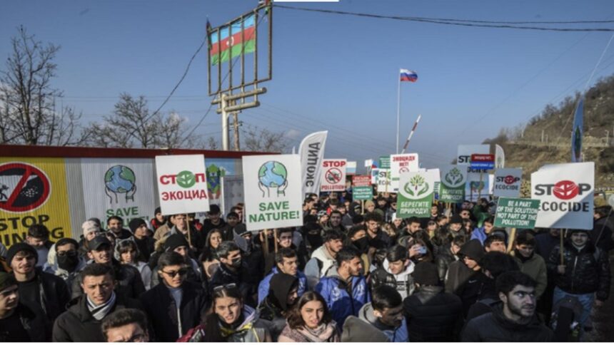 Στις 12 Δεκεμβρίου εμφανίστηκαν στο δρόμο που διασχίζει τον λεγόμενο διάδρομο του Λατσίν και που είναι ο δρόμος που συνδέει την Αρμενία με το Ναγκόρνο Καραμπάχ, «ακτιβιστές υπέρ του περιβάλλοντος» που υποτίθεται ότι διαμαρτύρονται για παράνομες εξορύξεις και με αυτό τον τρόπο απέκοψαν το Ναγκόρνο Καραμπάχ από την πρόσβαση σε βασικές προμήθειες. Επισήμως, η κυβέρνηση του Αζερμπαϊτζάν αρνείται οποιαδήποτε ανάμειξη στον αποκλεισμό, υποστηρίζοντας ότι πρόκειται για νόμιμη οικολογική διαμαρτυρία. Το αποτέλεσμα είναι το Ναγκορνο-Καραμπάχ να αντιμετωπίζει μια ανθρωπιστική κρίση καθώς δεν φτάνουν κρίσιμα προϊόντα όπως φάρμακα, βρεφικό γάλα σε σκόνη, την ώρα που τα πράγματα κάνουν χειρότερα οι διακοπές στην παροχή ρεύματος και φυσικού αερίου στις οποίες προχωρά η κυβέρνηση του Αζερμπαϊτζάν. Μάλιστα, στις 30 Ιανουαρίου οι εκπρόσωποι της Αρμενίας υποστήριξαν ότι ο συγκεκριμένος αποκλεισμός ουσιαστικά προλειαίνει το έδαφος για την εθνοκάθαρση του Ναγκόρνο-Καραμπάχ.