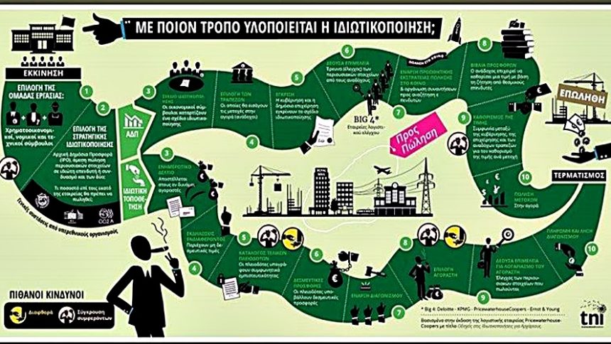Η δημόσια περιουσία δεν ιδιωτικοποιείται, όπως παραπλανητικά αναφέρεται. Συχνά, είναι ξένες κρατικές εταιρείες που αγοράζουν τις ελληνικές, από τις τηλεπικοινωνίες και την ενέργεια μέχρι τα λιμάνια και τους φυσικούς πόρους. Με άλλα λόγια, η δημόσια περιουσία, συχνά κρίσιμες λειτουργίες για την κοινωνία, όχι μόνο απαξιώθηκαν αλλά και αποεθνικοποιούνται.