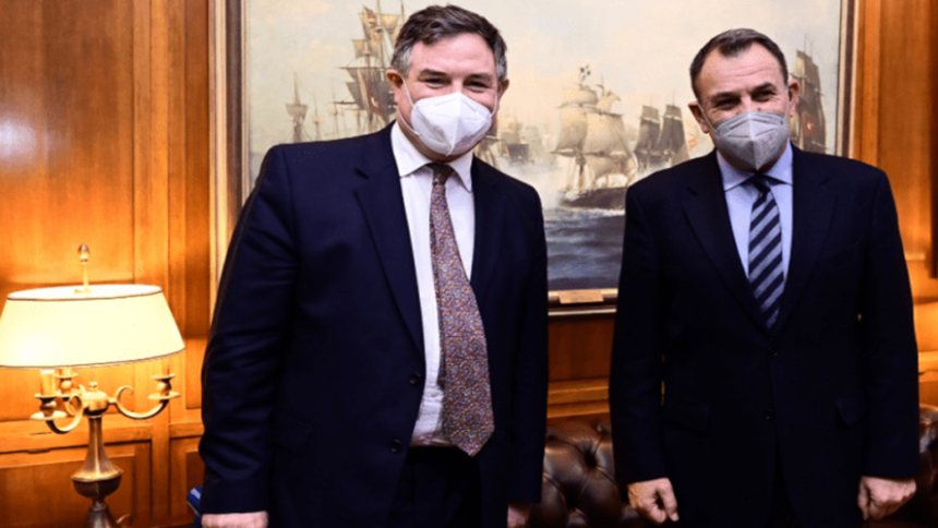 Υπουργός Εθνικής Αμύνης κ. Νικόλαος Παναγιωτόπουλος δέχθηκε σήμερα στο γραφείο του τον Υφυπουργό Αμύνης του Ηνωμένου Βασιλείου κ. Τζέρεμυ Κιν (JeremyQuin).