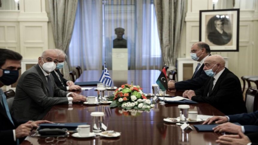 Κοινό μήνυμα ότι «πρέπει να φύγουν όλες οι ξένες δυνάμεις και οι μισθοφόροι από το έδαφος της Λιβύης» έστειλαν κατά τη συνάντησή τους στο υπουργείο Εξωτερικών, ο υπουργός Εξωτερικών, Νίκος Δένδιας και ο πρόεδρος της Βουλής των Αντιπροσώπων της Λιβύης, Αγκίλα Σάλεχ.