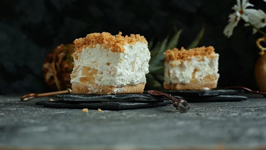 Ψήστε τη βάση σύμφωνα με τις οδηγίες και όταν κρυώσει ρίξτε το μείγμα με τον ανανά.