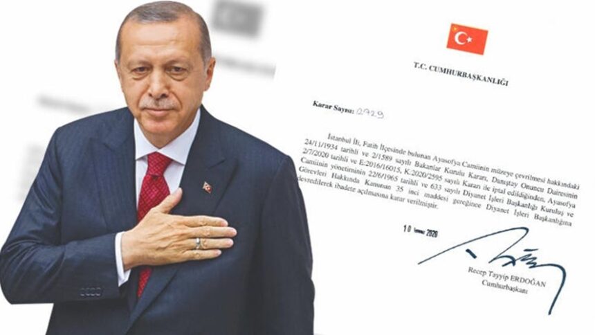 Την επαναλειτουργία της εμβληματικής εκκλησίας της Αγιάς Σοφιάς στην Κωνσταντινούπολη ως ισλαμικού τεμένους, μετά από 86 χρόνια, επικύρωσε την Παρασκευή το απόγευμα ο πρόεδρος της Τουρκίας, Ρετζέπ Ταγίπ Ερντογάν, με προεδρικό διάταγμα το οποίο υπέγραψε.