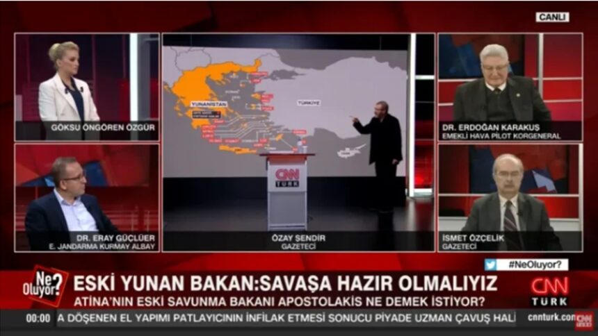 «Η Ελλάδα δεν μπορεί να επεκτείνει τα χωρικά της ύδατα στα 12 ν.μ. νοτίως της Κρήτης, επειδή η Γαύδος είναι … τουρκική» υποστηρίζει προκλητικά ο απόστρατος αντιπτέραρχος Ερντογάν Καρακούς, μιλώντας σε εκπομπή του CNN Turk.