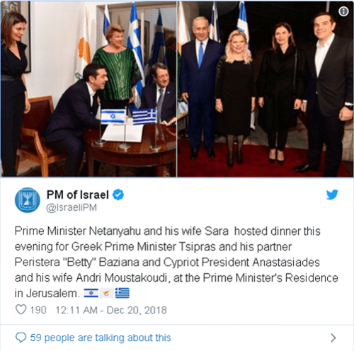 WATCH: Prime Minister Netanyahu and his wife Sara host dinner for Greek Prime Minister Tsipras and his partner Peristera "Betty" Baziana and Cypriot President Anastasiades and his wife Andri Moustakoudi, at the Prime Minister's Residence in Jerusalem. pic.twitter.com/CQtFFHlRpH