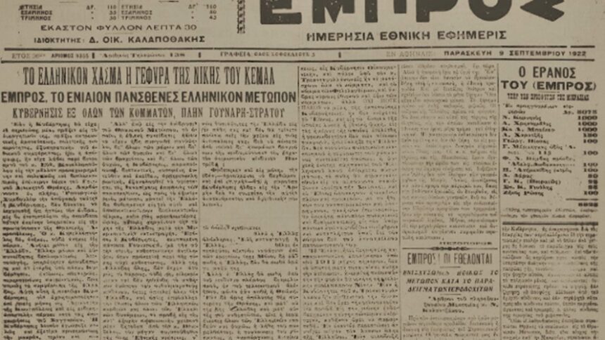 «Το μαρτύριον των Μικρασιατών προσφύγων μετήχθη από της παραλίας της Σμύρνης εις την παραλίαν του Πειραιώς. […] Οι Μικρασιάται λιμοκτονούν εν Πειραιεί ακριβώς όπως ελιμοκτόνησαν και εν Σμύρνη κατά τας ημέρας που εμεσολάβησαν από της εκκενώσεως της πόλεως μέχρι της επιβάσεώς των επί των πλοίων. […] Είνε αληθές ότι εις την ομοιότητα της καταστάσεως ταύτης υπάρχει μία διαφορά. Αλλ’ η διαφορά αύτη περιορίζεται αποκλειστικώς εις το είδος του θανάτου ο οποίος αναμένει αναποτρέτως τους ατυχείς πρόσφυγας»