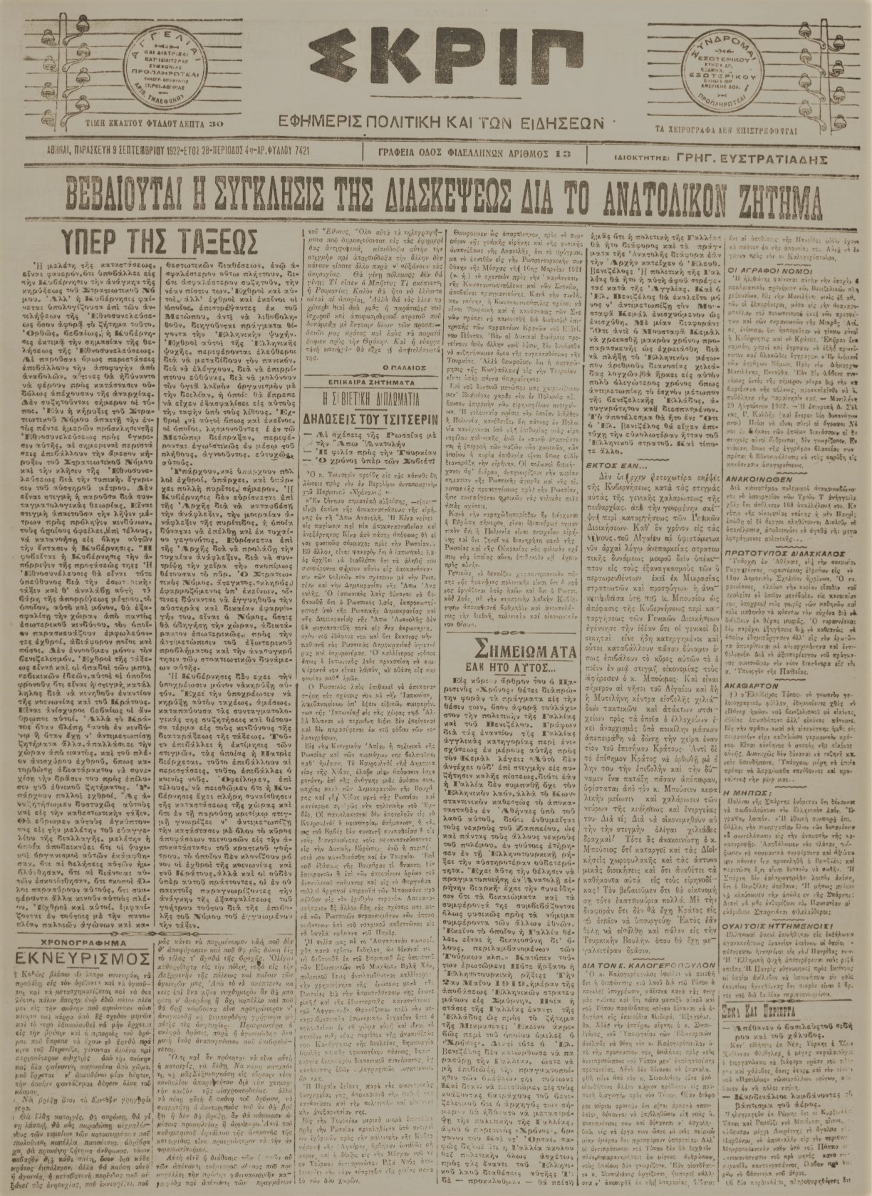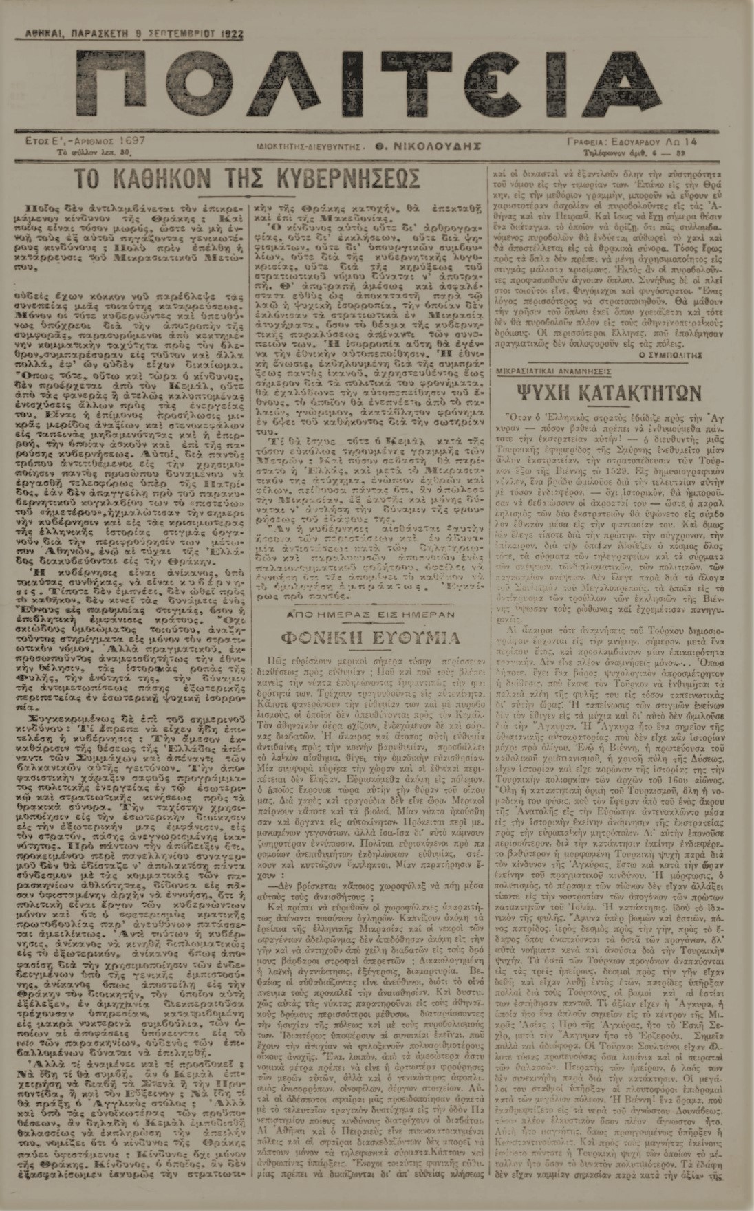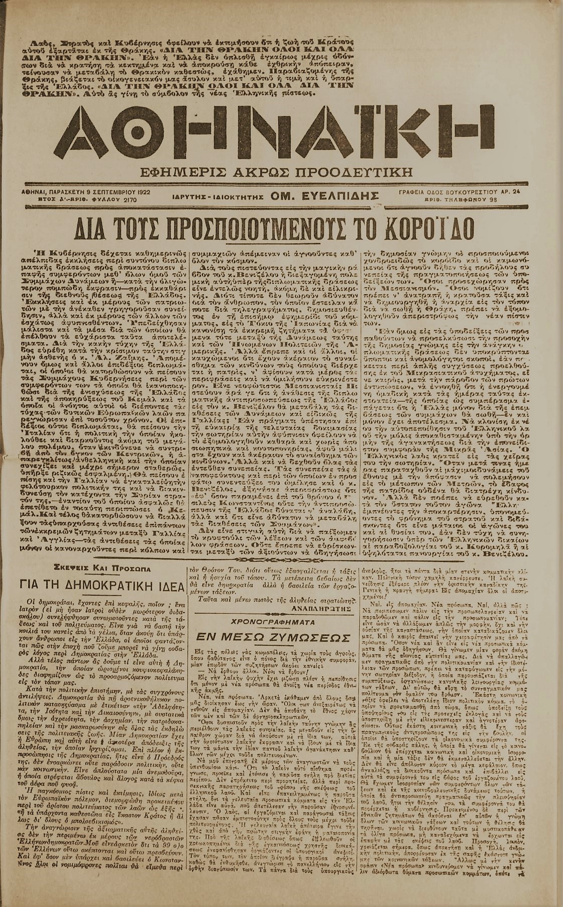«Η παρούσα ώρα είνε ώρα του κ. Βενιζέλου. […] Δυστυχώς η Κυβέρνησις, θύμα των παρασκηνιακών ενεργειών των εργατών της μικρασιατικής ατυχίας, διστάζει και αναβάλλει. Και μελετά την επιβολήν στρατιωτικού νόμου, διά να πνίξη κάθε κραυγήν αγωνίας, κάθε φωνήν του λαού. Και αποφασίζει το μέλλον της Ελλάδος, χωρίς ν’ ακουσθή ο λόγος εκείνων, οι οποίοι θα ηδύναντο να την σώσουν από την πλήρη καταστροφήν»