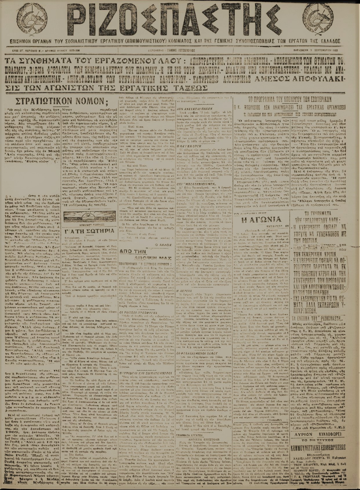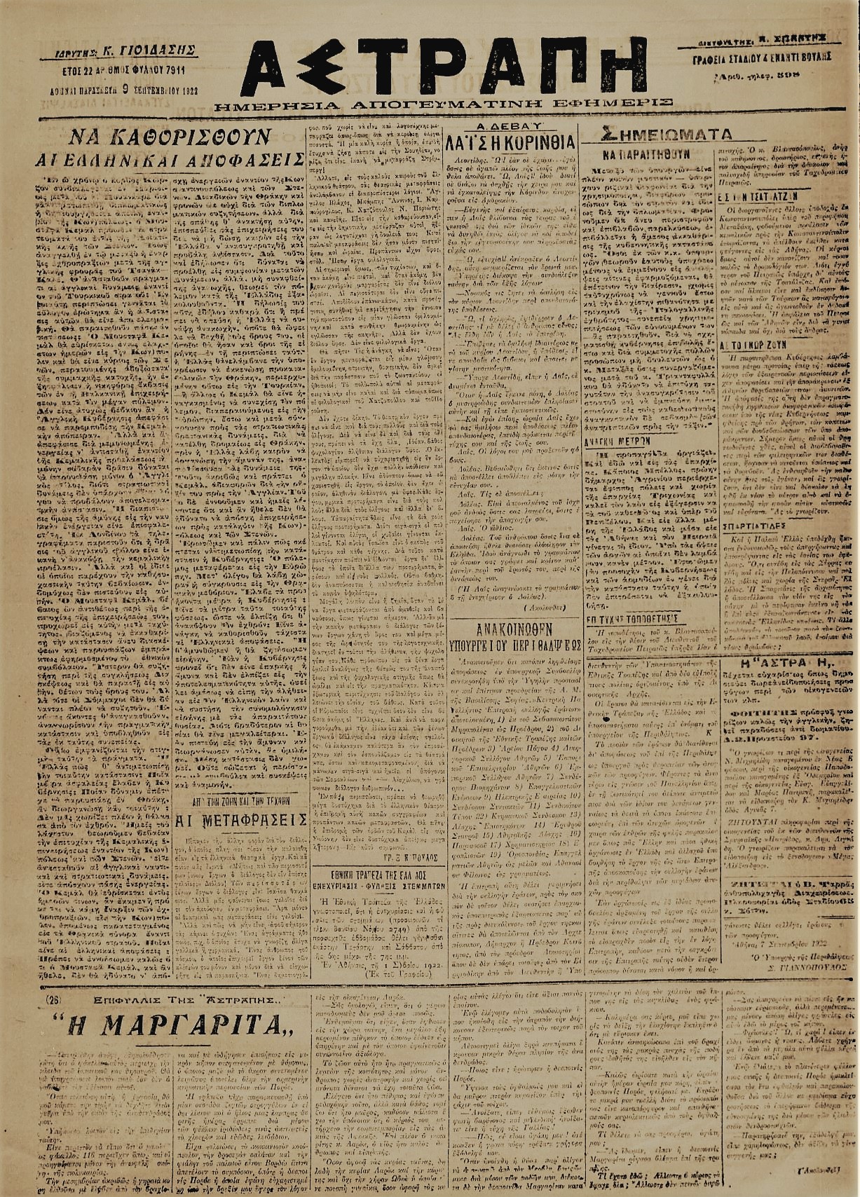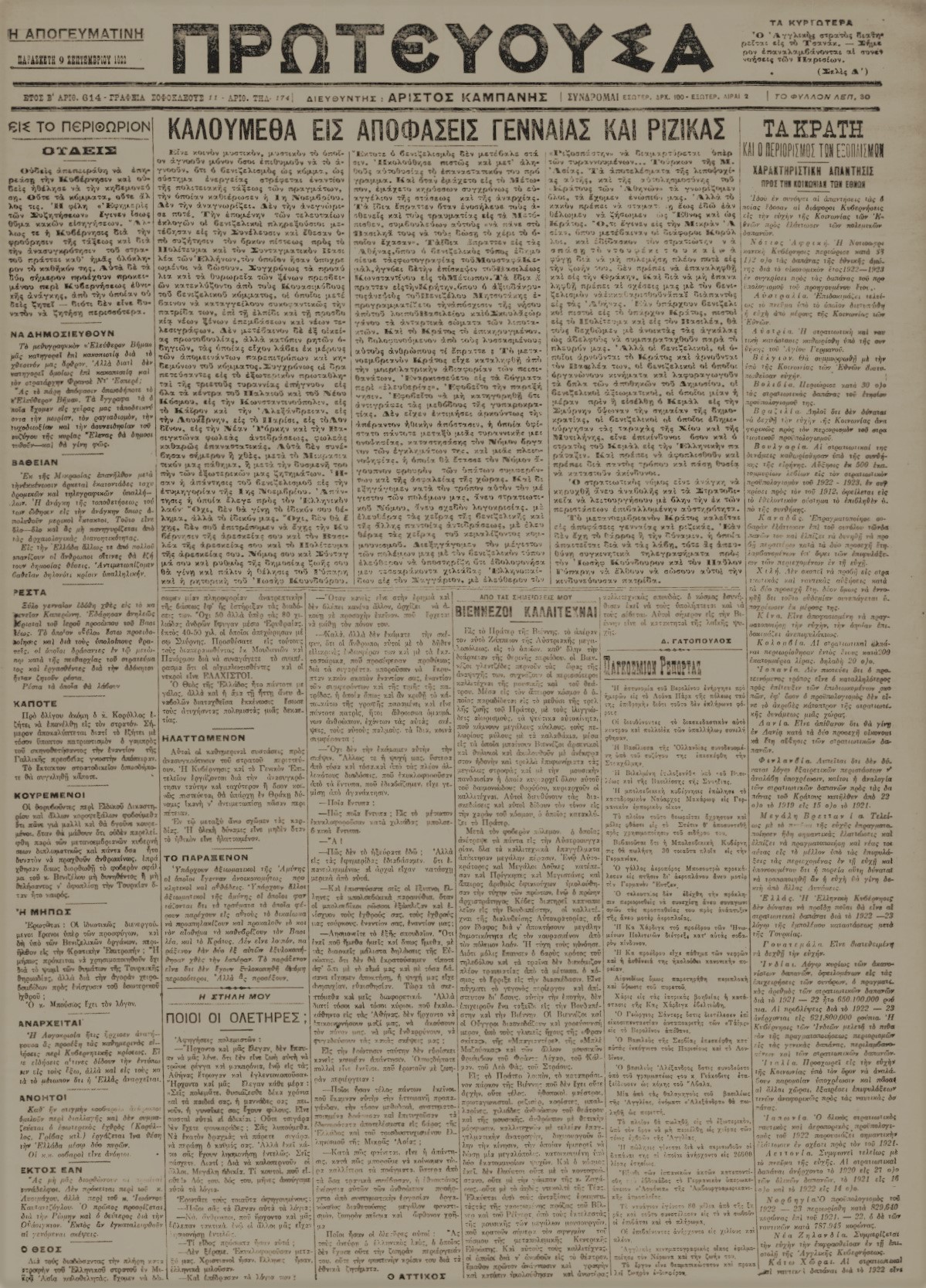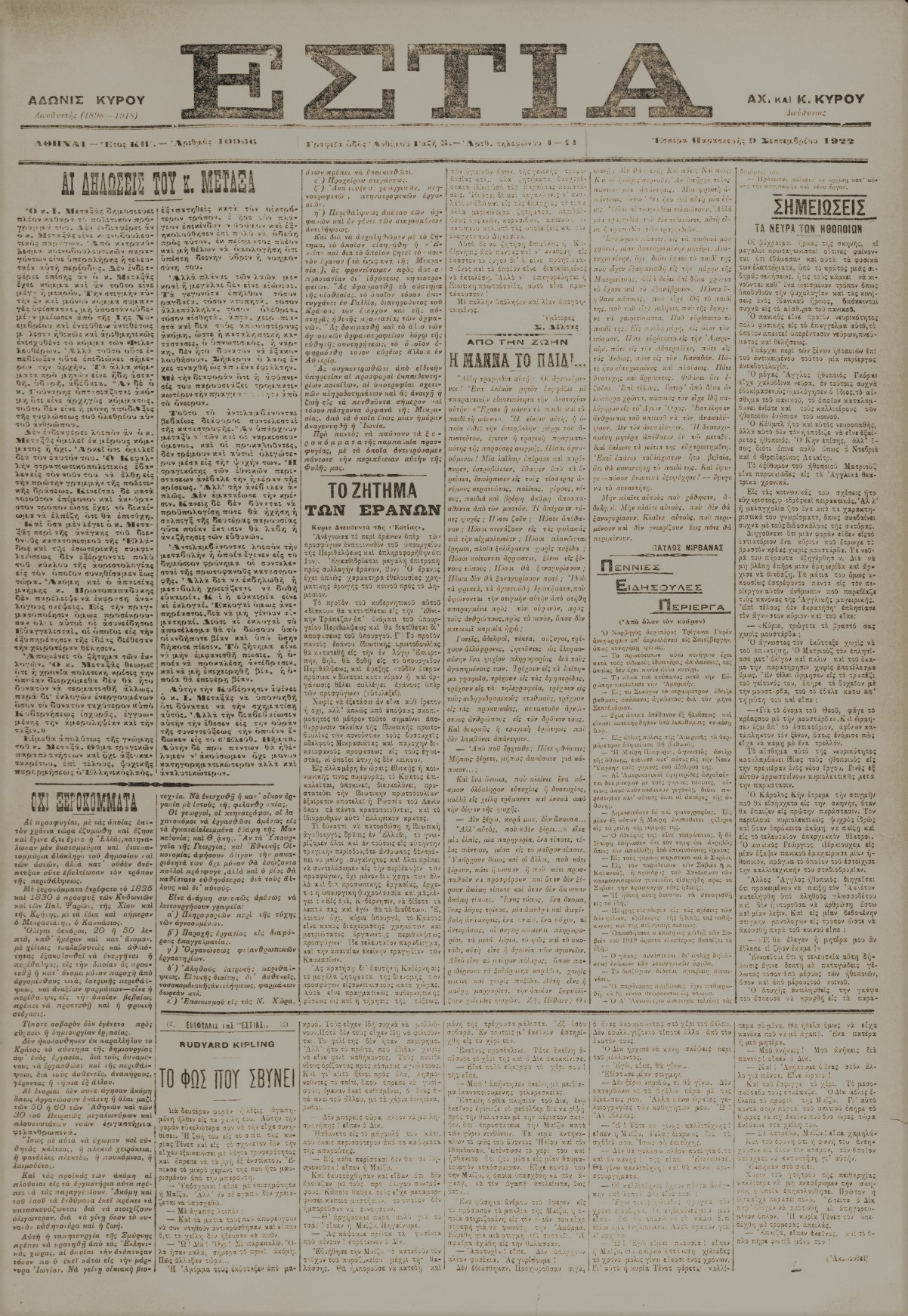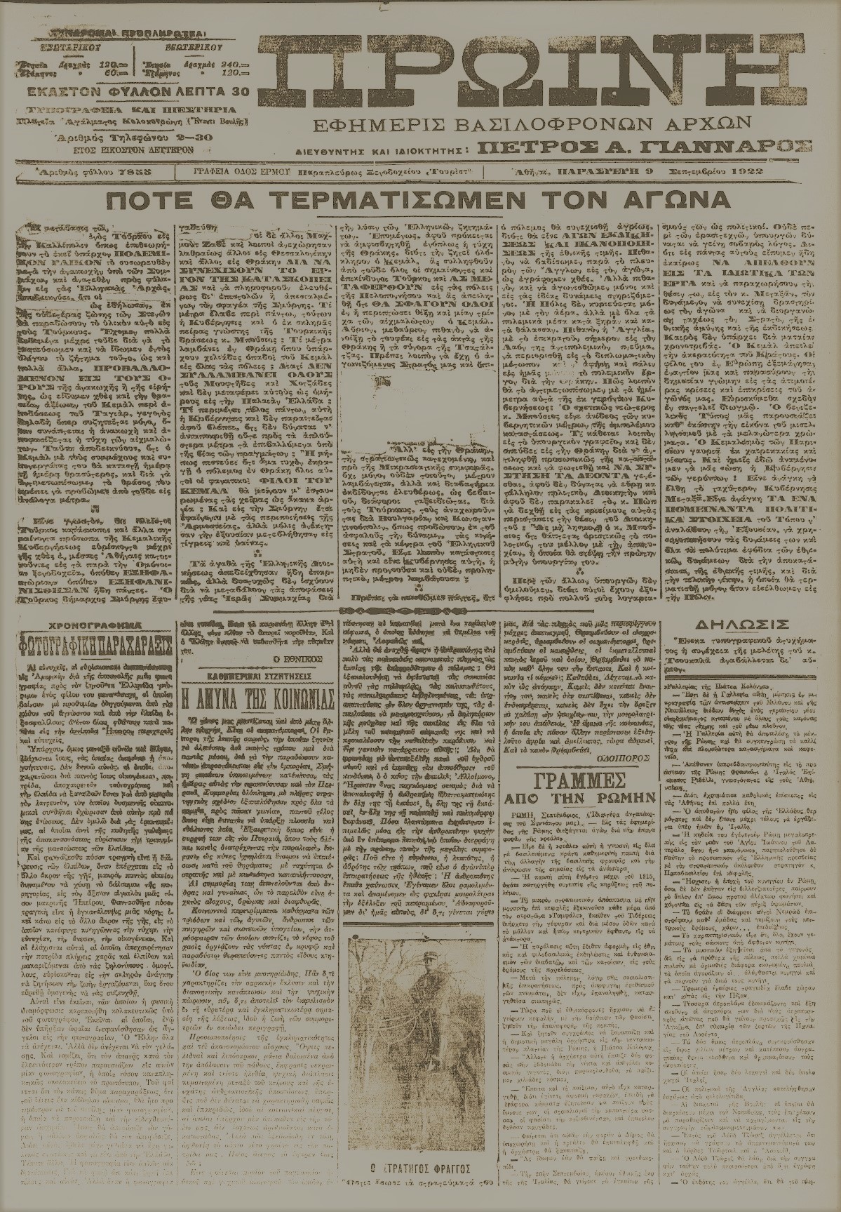 «Ευρισκόμεθα σχεδόν εν παντελεί διωγμώ. Ο βενιζελικός Τύπος μας παρουσιάζει καθ’ εκάστην την εικόνα του μισελληνισμού με τα μελανώτερα χρώματα. Ο Κεμαλισμός των Παρισίων γαυριά εκ χαιρεκακίας και μίσους. Και ημείς εδώ αναμένομεν να μας σώση η Κυβέρνησις των γερόντων! Είνε ανάγκη να έλθη το ταχύτερον Κυβέρνησις Μεταξά. Είνε ανάγκη ΤΑ ΕΝΑΠΟΜΕΙΝΑΝΤΑ ΠΟΛΙΤΙΚΑ ΣΤΟΙΧΕΙΑ του Τόπου ν’ αναλάβουν την Εξουσίαν (…) διά την αποκατάστασιν της εθνικής τιμής και διά την τελικήν νίκην, η οποία θα τερματισθή μόνον όταν εισέλθωμεν εις την Πόλιν»