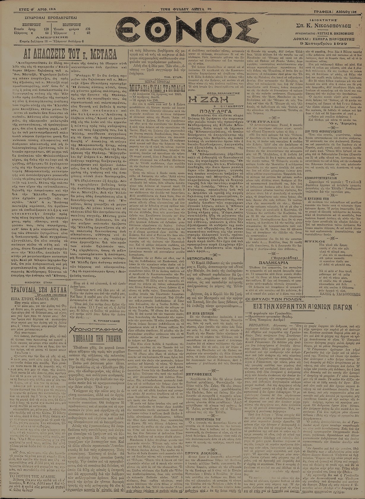 «Δεν θα κηρυχθώμεν βεβαίως υπέρ της αναθέσεως Κυβερνήσεως εις τον κ. Μεταξάν. Διά την Ελλάδα μόνη οδός ανορθώσεως είνε η διακυβέρνησίς της από Εκείνον, όστις γνωρίζει να μεγαλουργή. Αι μέσαι λύσεις και αι πλάγιαι οδοί δεν επιτρέπονται εις τοιαύτας στιγμάς. Πάντως χαίρομεν, διότι βλέπομεν, ότι εις τον στείρον πολιτικόν ορίζοντα της Ελλάδος εμφανίζεται είς νέος πολιτικός διαπνεόμενος από ειλικρίνειαν, ευθύτητα και αποφασιστικότητα»
