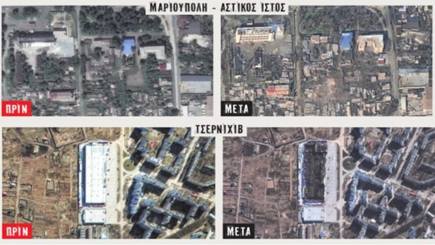 Αποκαρδιωτικές είναι οι εικόνες από τους δορυφόρους που δείχνουν το μέγεθος της καταστροφής στις ουκρανικές πόλεις και στα χωριά απ’ όπου πέρασαν οι ρωσικές δυνάμεις σε δύο και πλέον εβδομάδες επιχειρήσεων.