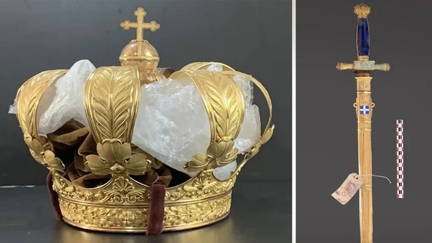 Έκπληκτα έμειναν το περασμένο καλοκαίρι τα στελέχη των αρμόδιων υπηρεσιών του υπουργείου Πολιτισμού που βρέθηκαν στο Τατόι για εργασίες τεκμηρίωσης των πολιτιστικών αγαθών και των κινητών αντικειμένων του πρώην βασιλικού ανακτόρου, όταν αντίκρισαν πως είχαν μείνει ανέπαφα και προσεκτικά φυλαγμένα σε μια από τις αίθουσες τα διακριτικά του πρώτου μονάρχη του ελληνικού κράτους, Όθωνα Α’. Το περίτεχνο στέμμα, το ξίφος και το σκήπτρο, ούτε ο τέως βασιλιάς Κωνσταντίνος Γλύξμπουργκ τα είχε πάρει μαζί του στην Αγγλία όταν μετέφερε αρχές της δεκαετίας του 1990 με κοντέινερ τη λεγόμενη «βασιλική περιουσία», αλλά ούτε είχαν κλαπεί από όσους είχαν τρυπώσει κατά καιρούς στα πάλαι ποτέ ανάκτορα.