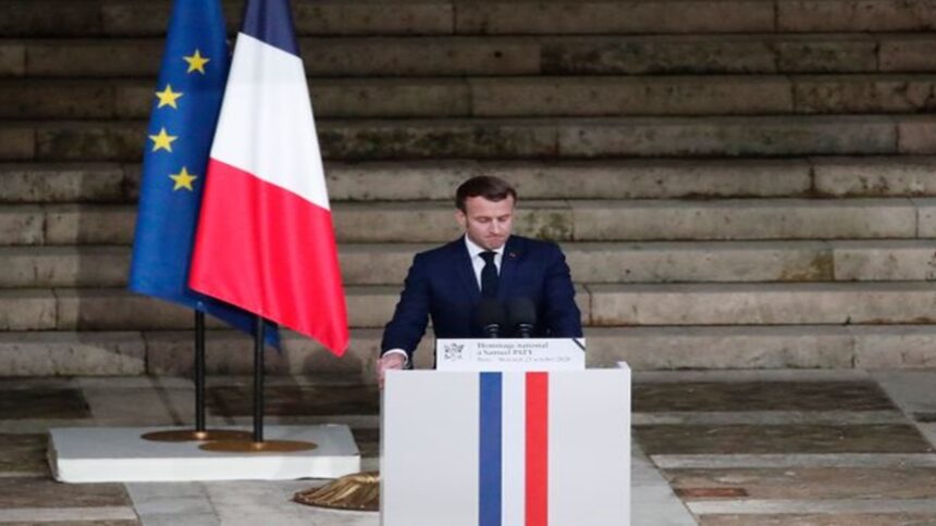 Photo: Associated Press/Ο Γάλλος πρόεδρος Εμμανουέλ Μακρόν δίπλα στο φέρετρο του σφαγιασθέντα καθηγητή Σαμιούλ Πατί στη Σορβώνη