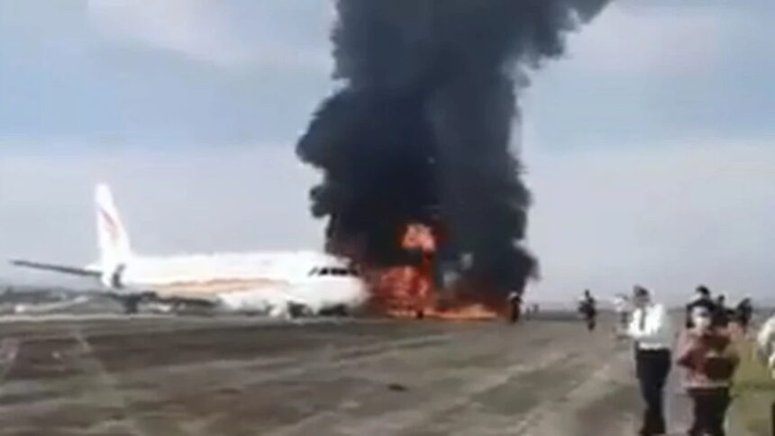 Βίντεο που μεταδόθηκε από το δημόσιο τηλεοπτικό δίκτυο CCTV εικονίζει αεροσκάφος στον διάδρομο φλεγόμενο στη μια του πλευρά, καθώς πυκνή στήλη μαύρου καπνού υψώνεται στον ουρανό.