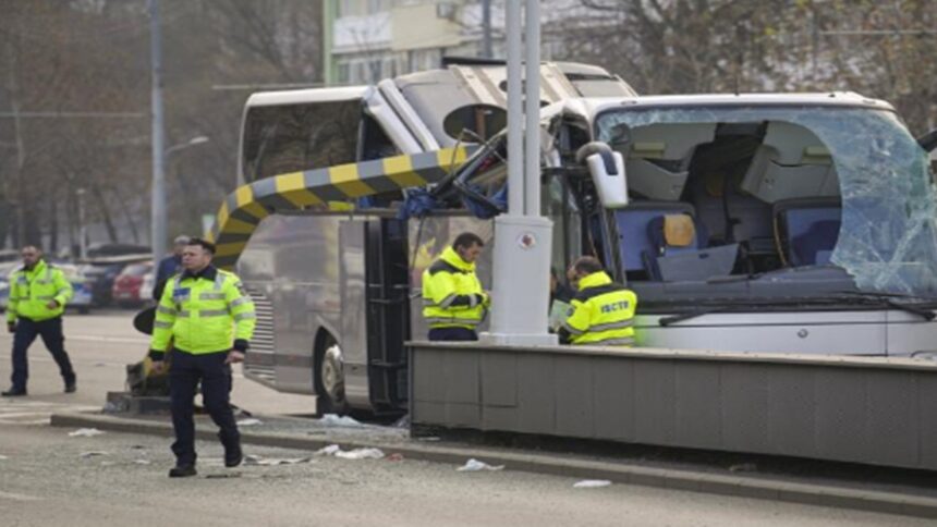 Το τουριστικό λεωφορείο που είχε ξεκινήσει από τον Βόλο και τη Λάρισα, με 47 επιβαίνοντες, σύμφωνα με τα ρουμανικά ΜΜΕ «παραβίασε το όριο ύψους, σε κεντρικό δρόμο, στο Βουκουρέστι και προσέκρουσε σε μεταλλική δοκό για τη σήμανση».