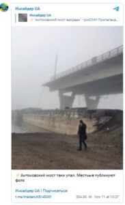 Η γέφυρα Αντονίβσκι, η μόνη κοντινή οδική διάβαση από τη Χερσώνα προς την ελεγχόμενη από τη Ρωσία ανατολική όχθη του ποταμού Δνείπερου, κατέρρευσε, ανέφερε την Παρασκευή ο δημόσιος ραδιοτηλεοπτικός φορέας της Ουκρανίας Suspilne, επικαλούμενος τοπικούς κατοίκους.