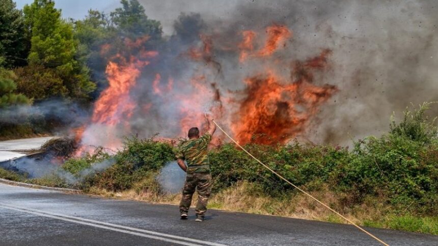Σύμφωνα με την Πυροσβεστική, η φωτιά καίει σε δύσβατο σημείο μέσα σε χαράδρα, χωρίς να απειλεί κατοικημένες περιοχές.