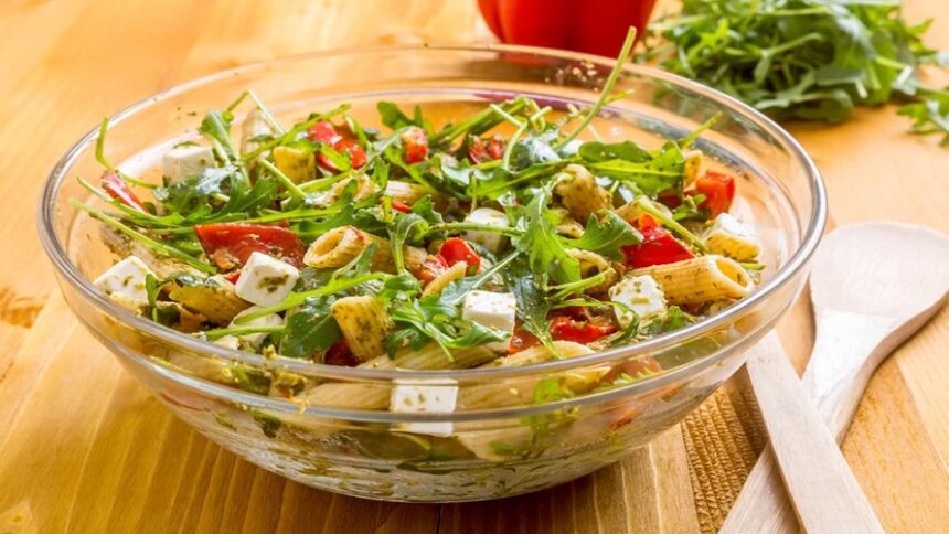 Σε ένα μεγάλο μπολ σερβιρίσματος ρίξτε τα ζυμαρικά με τα υπόλοιπα υλικά και ανακατέψτε μέχρι να ενωθούν.