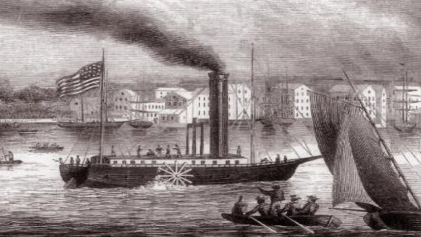 Το «Κλέρμον», το πρώτο πλοίο που κινείται με ατμό και κατασκευάστηκε από τον Ρόμπερτ Φούλτον, κάνει το παρθενικό του ταξίδι στον ποταμό Χάτσον.