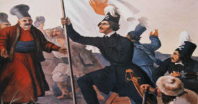 Ο πρόκριτος Ζαφειράκης Θεοδοσίου υψώνει τη σημαία της Επανάστασης στη Νάουσα.