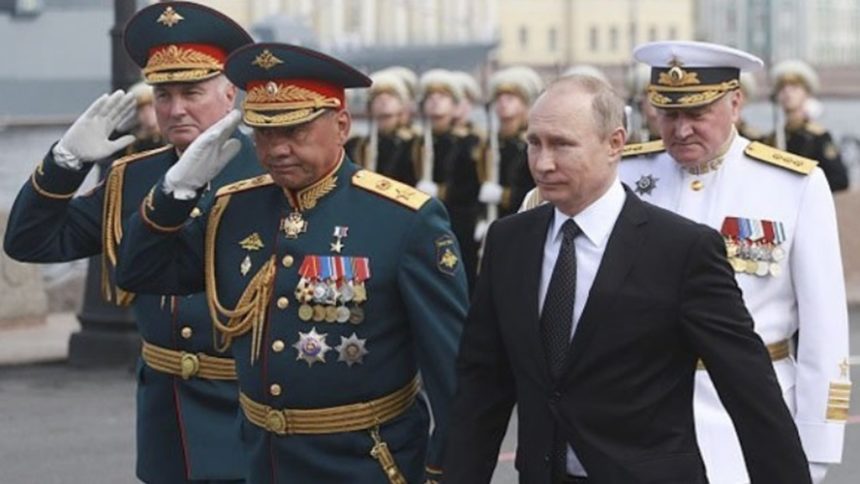 | Russian President Vladimir Putin and Russian Minister of Defence Sergei Shoigu attend a ship parade marking Russian Navy Day in St. Petersburg, Russia on 30 July 2017. Source: Sergey Mihailicenko/Anadolu Agency/Getty Images |