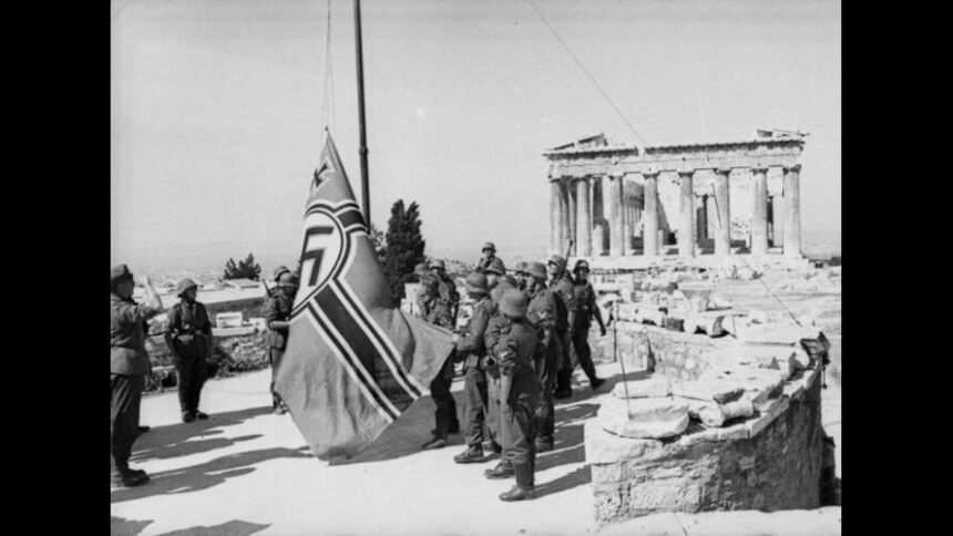 Δύο 19χρονοι φοιτητές, ο Μανώλης Γλέζος και ο Απόστολος Σάντας, με μία παράτολμη ενέργειά τους, κατεβάζουν από την Ακρόπολη τη γερμανική σημαία και αναρτούν την ελληνική.
