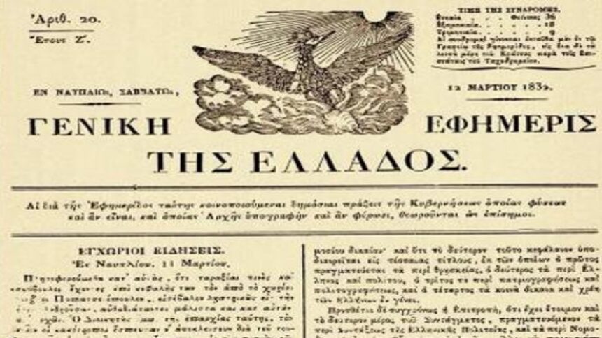 Εκδίδεται το πρώτο φύλλο της Γενικής Εφημερίδος της Ελλάδος, προδρόμου της Εφημερίδας της Κυβερνήσεως. Διευθυντής της ο Θεόκλητος Φαρμακίδης.
