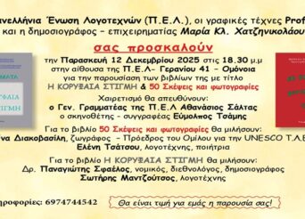 Η Πανελλήνια Ένωση Λογοτεχνών (Π.Ε.Λ.), οι γραφικές τέχνες Proforma και η επιχειρηματίας – δημοσιογράφος Μαρία Κλ. Χατζηνικολάου σας προσκαλούν την Παρασκευή 12 Δεκεμβρίου 2025 στις 18.30 μ.μ στην αίθουσα της Π.Ε.Λ – Γερανίου 41 – Ομόνοια για την παρουσίαση των βιβλίων της με τίτλο: Η ΚΟΡΥΦΑΙΑ ΣΤΙΓΜΗ και 50 Σκέψεις και φωτογραφίες.