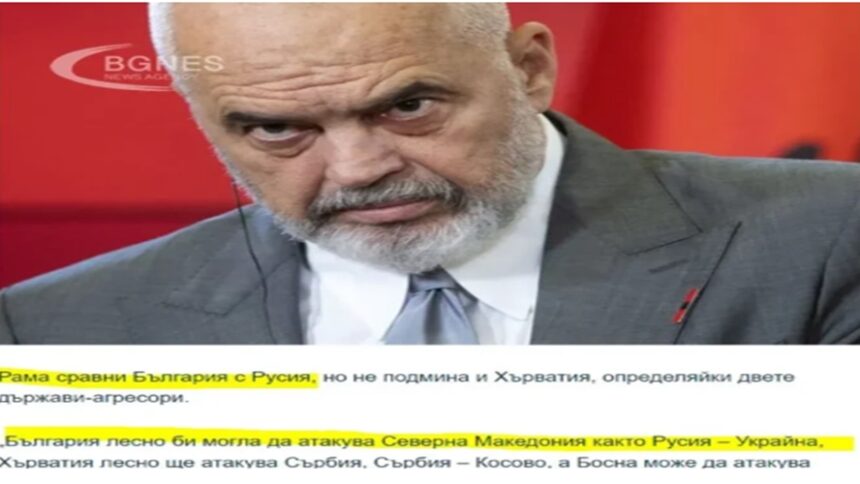 Η Βουλγαρία μπορεί εύκολα να επιτεθεί στη Βόρεια Μακεδονία χωρίς αμφιβολία, η Κροατία μπορεί εύκολα να επιτεθεί στη Σερβία, η Σερβία-Κόσοβο, η Βοσνία μπορεί να έχουν εσωτερικές επιθέσεις, εμείς, η Αλβανία, μπορούμε να ζητήσουμε από τους Έλληνες να μας επιτεθούν και αυτοί θα το κάνουν με χαρά, το Μαυροβούνιο μπορεί απλώς να ξαπλώσει στην παραλία. Και έτσι θα είμαστε όλοι έτοιμοι να μπούμε μαζί με την Ουκρανία», είπε ο Ράμα.