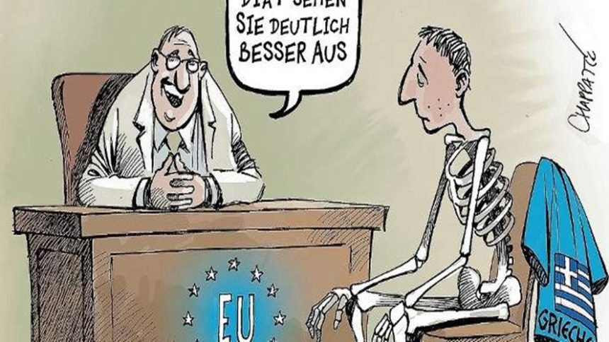 Αφιερωμένη στην Ελλάδα και στο τέλος των προγραμμάτων προσαρμογής είναι η γελοιογραφία στο περιοδικό «Der Spiegel» που κυκλοφορεί το Σάββατο 7 Ιουλίου.